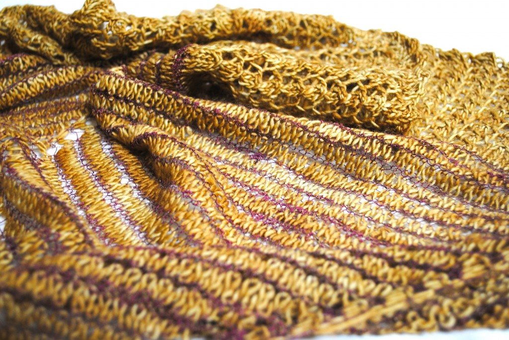 In this version I used one strand of Habu A-20 Silk Stainless Steel in 7 Yamabuki Orange and Jade Sapphire Lacy Lamb in NY109. I thought that the Lacy Lamb needed a little Umph! which is why I chose to pair it with the Silk Stainless. The Silk Stainless is one of my favorite yarns, it seems like I have every color in my stash and I want to use it in everything I make. Here are a few images of the two held together living merrily in harmony.
