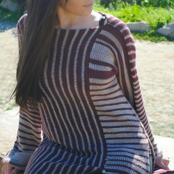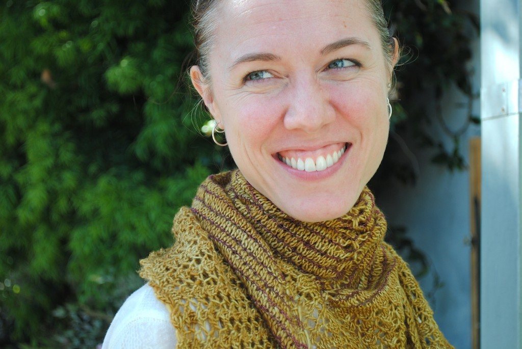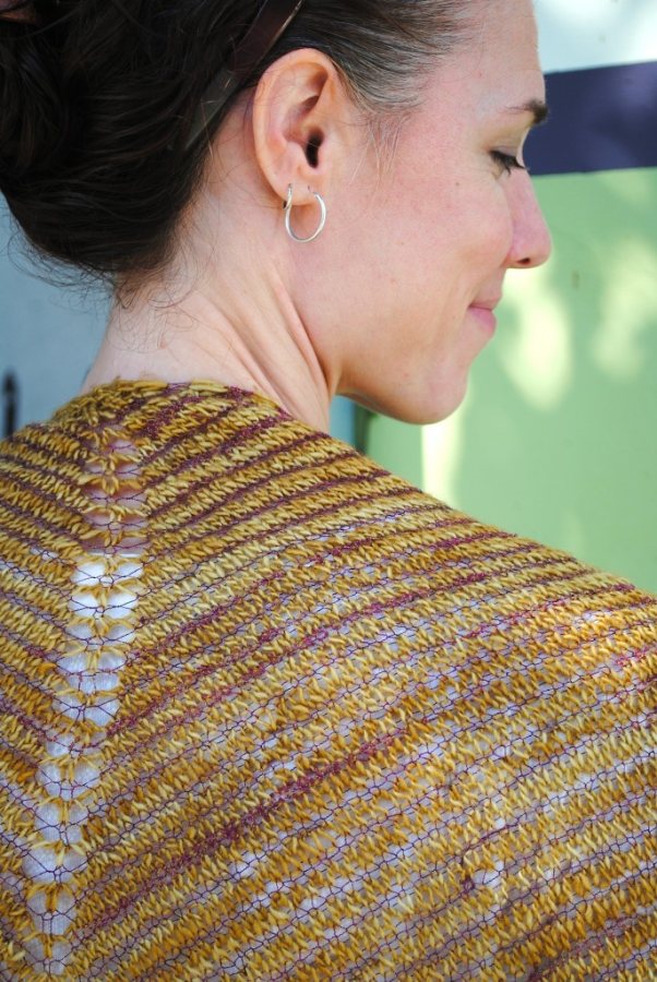 Here is yet another version of Crashing Waves. I did not knit this one, my friend Hanna knit this for Wildfiber. I would say this is the most interesting version of Crashing Waves I have seen so far. I love love love this one. She used Madelinetosh Tosh Merino Light in Faded Chinos alternating every two rows with Habu Textiles A-172 Spiral Slub in Wine. Here is my other friend Jess modeling the shawl.