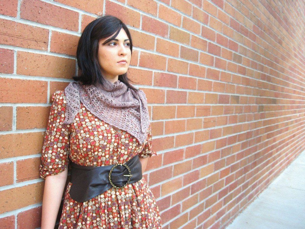 In this version I used less than one hank of Madelinetosh Prairie (100% superwash merino, 840 yards) in Vintage Frame (discontinued colorway). This is the large version featured in the pattern. Here is my lovely little sister modeling the shawl.