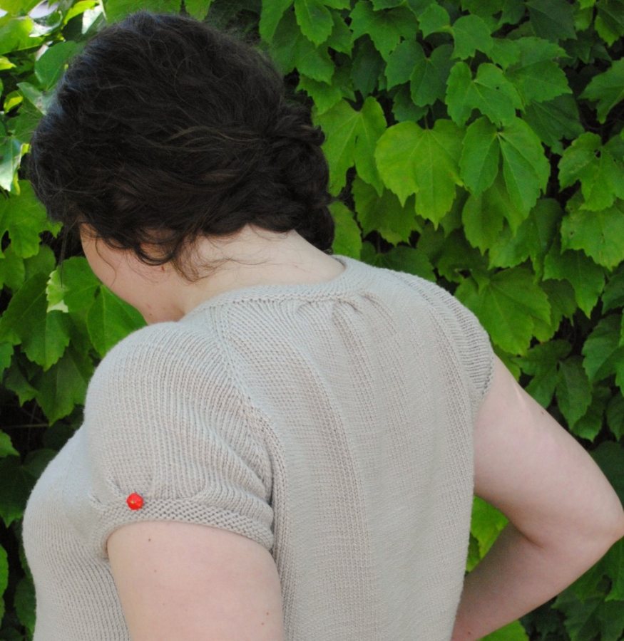 I knit this sweater using Louet Gems Sport (100% superwash merino wool, 225 yards) in #36 Linen Grey. The Gems is a really wonderful sport yarn, and when they say superwash they mean it. I threw this sweater both into the wash (with a little Soak of course) and the dryer and it still looks great. Then I added three vintage buttons (purchased at Wildfiber) down the button-band and one on each sleeve.