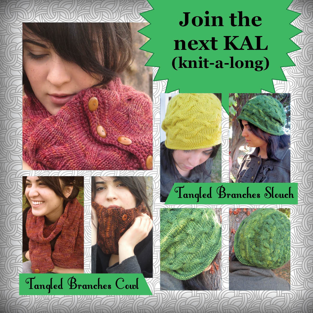 We are getting ready to start this KAL in a few days in the Ravelry group.  We start on Sunday, February 9th.  I hope you can join us.  This is your opportunity to knit the Tangled Branches slouch and/or the Reversible Tangled Branches Cowl with a community.  KALs are always fun! Lets do this!!!