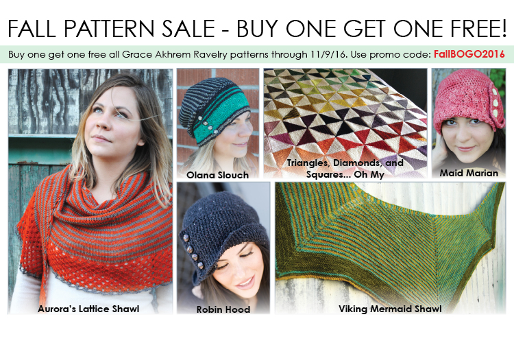 It’s been a while since I’ve had a proper sale. So I thought – if I’m going to have a sale it better be a good one. Â Now through Wednesday, November 9th, 2016 all the patterns in my Ravelry Store are buy one get one free with coupon code FallBOGO2016